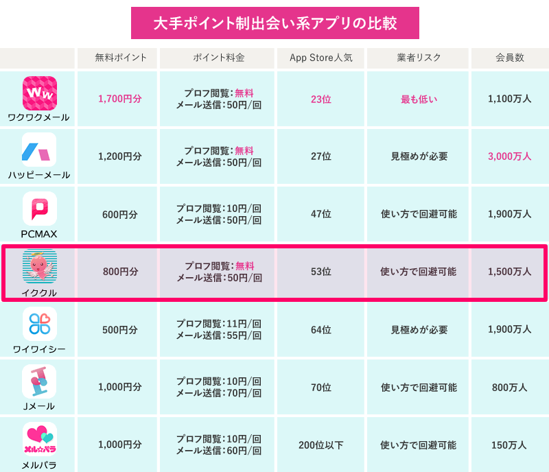 以下の表は、イククルとよく比較されるポイント制の出会い系を一覧でまとめてたものだ。