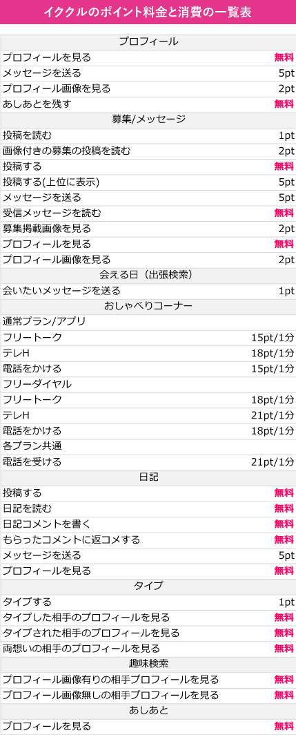 この中にはあまり使う必要がないものもあり、上記の赤くマークした機能“以外”については正直使いどころがない。そこで、イククルで女性と出会うのに有効な機能だけをピックアップしてポイント消費と料金をまとめてみた。