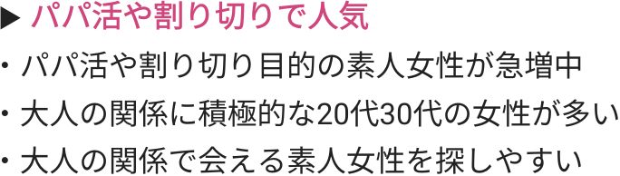 割り切りやパパ活など大人の出会いに特化していると言っても過言ではないぐらい、大人目的の女性が多い出会い系。男性会員間の競争が激しくないという使いやすさもメリットのひとつ。